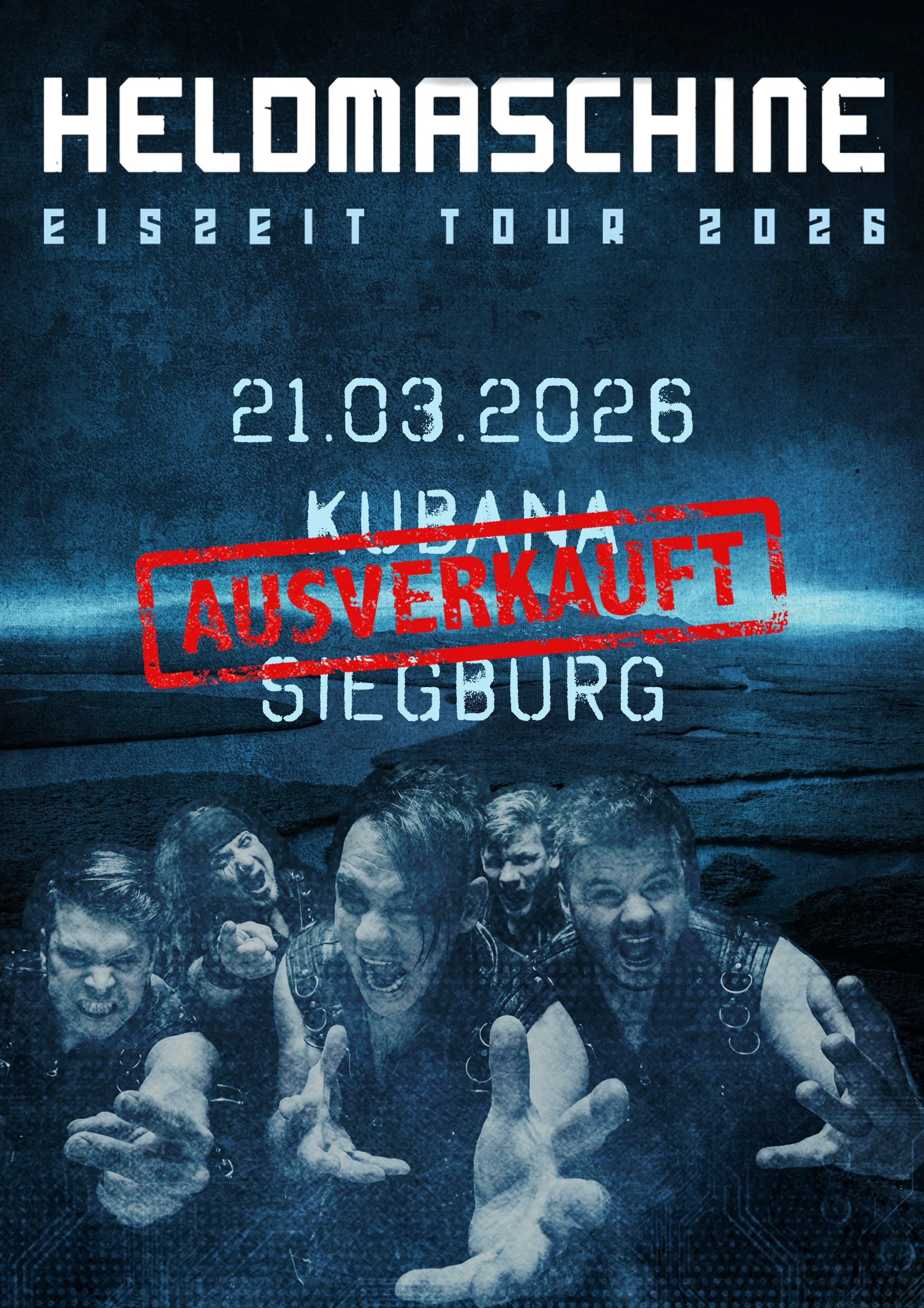 Wegen großer Nachfrage geht die Koblenzer Band 2026 erneut auf Tour! Das letzte Jahr zeigte überwiegend ausverkaufte Clubs. Und die bereits legendäre Heldmaschine-Show mit ihrem unverwechselbar wuchtigen Sound wird nochmals erweitert! Nach erfolgreichen Deutschland-und Europatouren mit Eisbrecher kann HELDMASCHINE es daher kaum erwarten, im März 2026 endlich wieder loszuziehen. Ihre unvergleichlich kraftvolle Live-Energie wird die HELDMASCHINE Eiszeit Tour 2026 zu einem garantiert einmaligen Erlebnis machen. Mit der aktuellen Show beweisen HELDMASCHINE erneut, eine der besten Livebands des Landes zu sein. Freut euch auf ganz große Momente mit HELDMASCHINE!